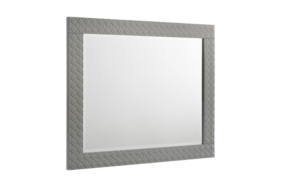 * Juego de dormitorio contemporáneo de cinco piezas estilo oriental con cama tamaño king * Acabado gris de alto brillo con relieve de mosaico de diamante tridimensional * La cama cuenta con luz LED táctil en la cabecera. * Cómoda y mesita de noche con cajones superiores forrados en fieltro * Construido con madera maciza, madera de ingeniería y laminado de papel. |