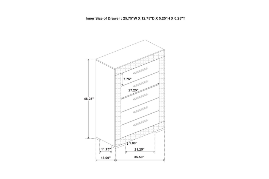 * Juego de dormitorio contemporáneo de cinco piezas estilo oriental con cama tamaño king * Acabado blanco de alto brillo con relieve de mosaico de diamante tridimensional * La cama cuenta con luz LED táctil en la cabecera. * Cómoda y mesita de noche con cajones superiores forrados en fieltro * Construido con madera maciza, madera de ingeniería y laminado de papel. |