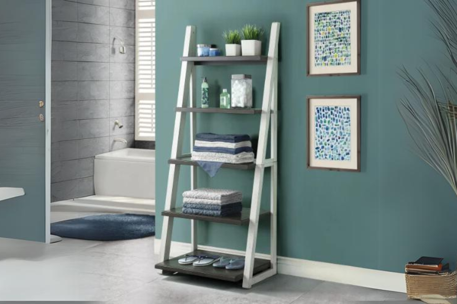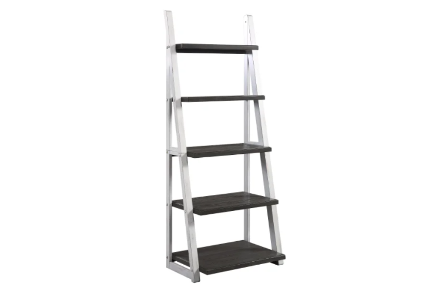 The Ashlyn Ladder Bookcase will complement any room in your home. A bold 72 inches high, it offers five fixed shelves. The shelves are designed in a step fashion with each shelf a bit larger than the next. Offering a multitude of display possibilities, the Ashlyn Ladder Bookcase features a two-tone antique white and gray finish. This bookcase is crafted with poplar solids and oak veneers.