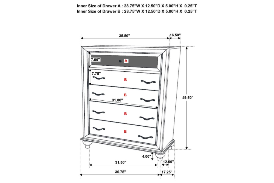 Includes: One (1) queen bed, one (1) nightstand, one (1) dresser, one (1) dresser mirror, and one (1) chest |
