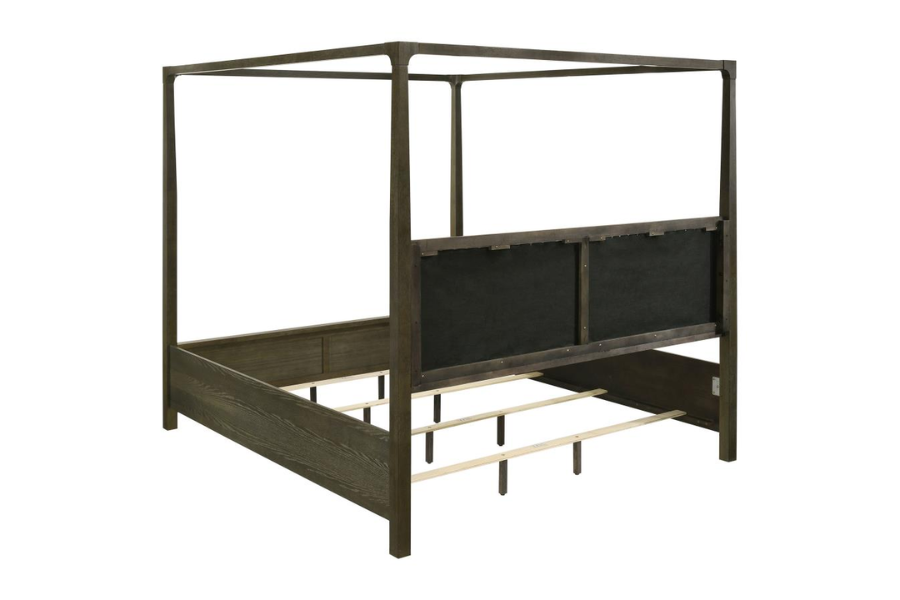 | * Four-piece queen canopy bedroom set * Transitional design with rounded corners and trending details * Dark cocoa finish with brass knobs for a sophisticated look * Solid hardwood and ash veneer construction for durability * Perfect for creating a sophisticated bedroom retreat |