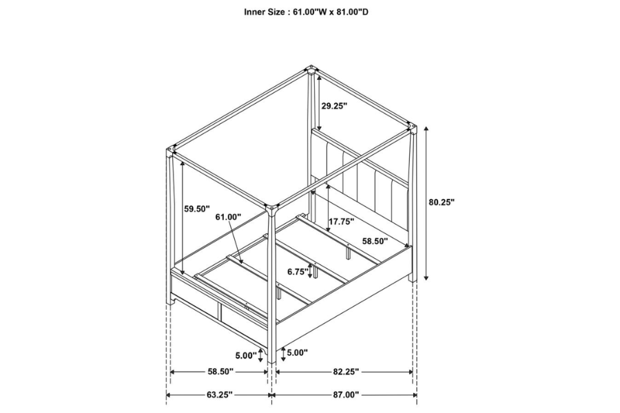 * Five-piece queen canopy bedroom set * Transitional design with rounded corners and trending details * Dark cocoa finish with brass knobs for a sophisticated look * Solid hardwood and ash veneer construction for durability * Perfect for creating a sophisticated bedroom retreat |