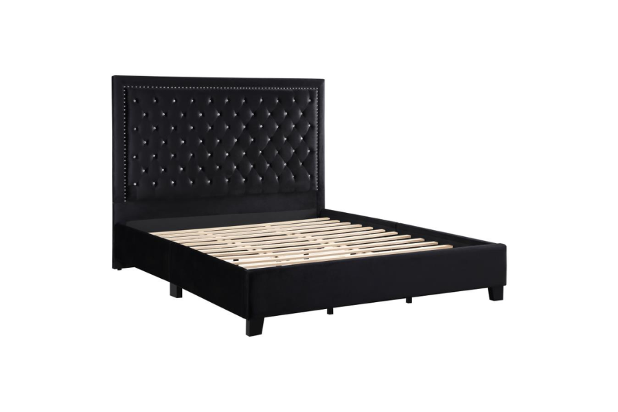 * Platform style bed frame offers an open, airy look to your bedroom space * An oversized headboard is perfect for creating focal walls * Upholstered in a soft black velvet that compliments numerous color palettes and offers plush texture * Sparkling acrylic buttons accent the tufted headboard paneling for a luxe vibe * Shiny nailhead trim defines the edges of the headboard to create captivating border design |