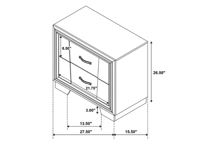 * Contemporary glamourous bedroom collection featuring glittering strips and shimmering drawer pulls * Subtle V-shaped panel design on the headboard and drawer fronts * Durable grey oak melamine finish * Black felt-lined top drawers to protect valuables * Low maintenance and easy to clean |