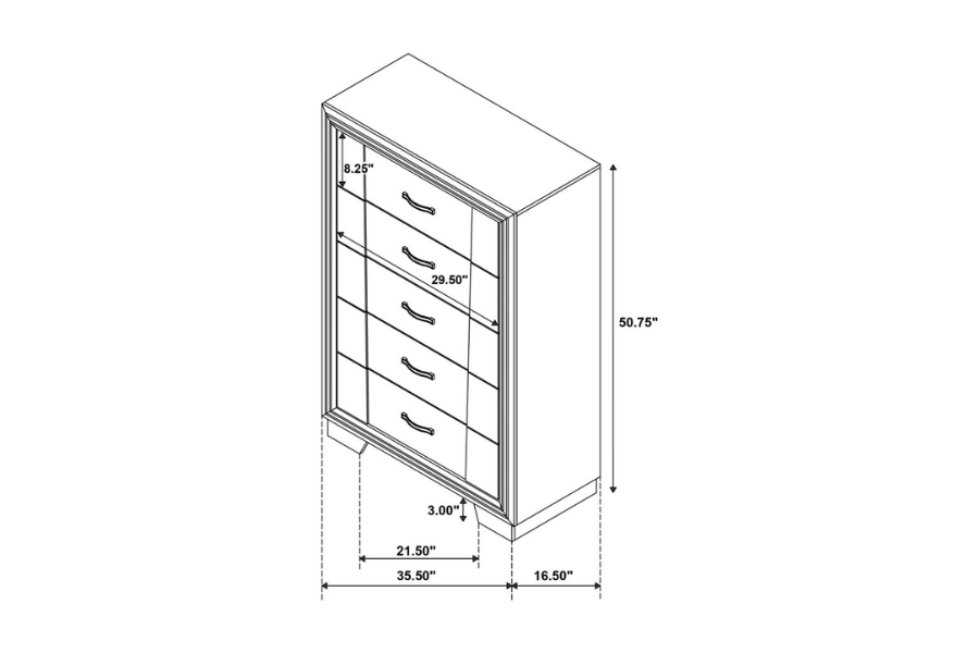 Includes: One (1) eastern king bed, one (1) nightstand, one (1) dresser, one (1) dresser mirror, and one (1) chest |