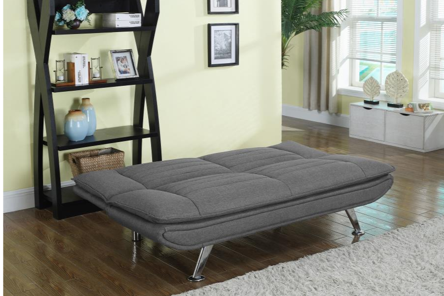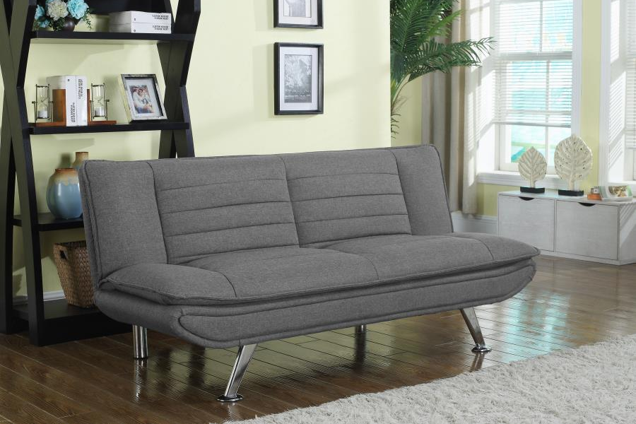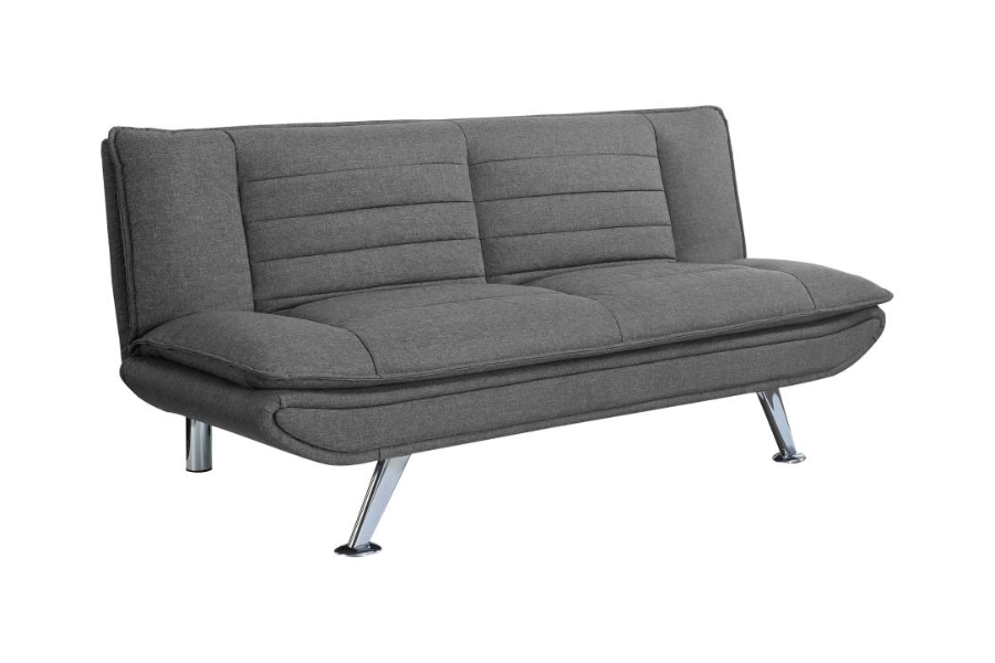 * Contemporary sofa bed upholstered in grey fabric * Channeled pillow-top seat and back * Back folds flat for easy conversion from sofa to bed * Kiln-dried hardwood frame * Durable sinuous spring decking with high resilience foam seat * Angled metal legs electroplated in chrome |