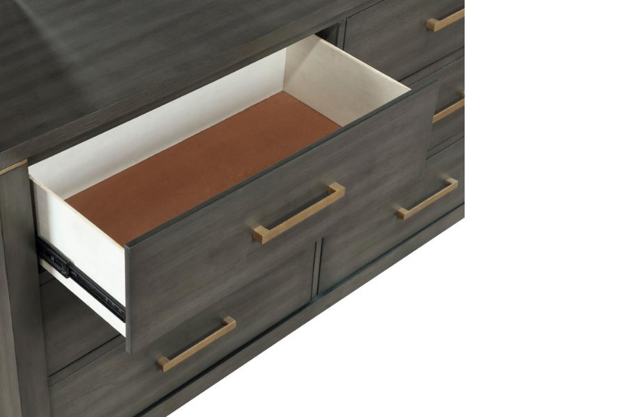 * A modern bedroom set is steeped in elegance, pairing a padded headboard with LED accent lighting * Grey wood grain finish on the bed and storage pieces is soft and on-trend with a timeless feel * Upholstered headboard features vertical panels with LED lighting that sets the mood * Golden brass toned trim and pulls add warmth and elegance to a tailored presentation * White LED light is operated with a touch button on the side of the headboard for easy access * Bed includes a center rail with support legs for added security and stability * Nightstand comes with a built-in USB port, providing a convenient and easily accessible charging solution for your devices |