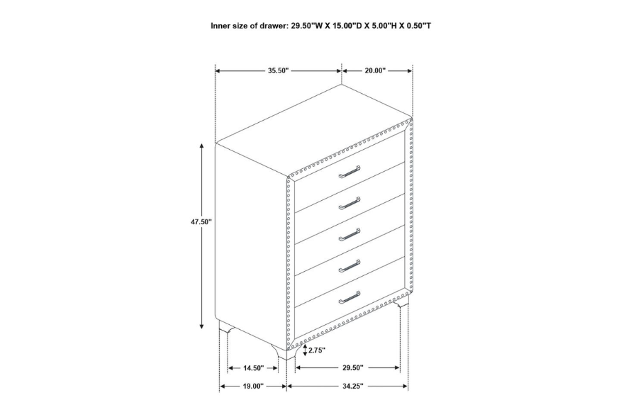 * Create a grand and glamorous feel in your bedroom with an elegance that will refresh your thoughts every time you enter * Entirely upholstered with matte velvet in options of pacific blue or grey with acrylic bling tufted buttons accented with crystal and chrome pull handles * Chrome finished metal legs and hand applied nailhead trim amplifies the design's contemporary expression * Exquisite with an impressive plush, matte velvet cover * Unbelievable value and exclusive to Coaster |