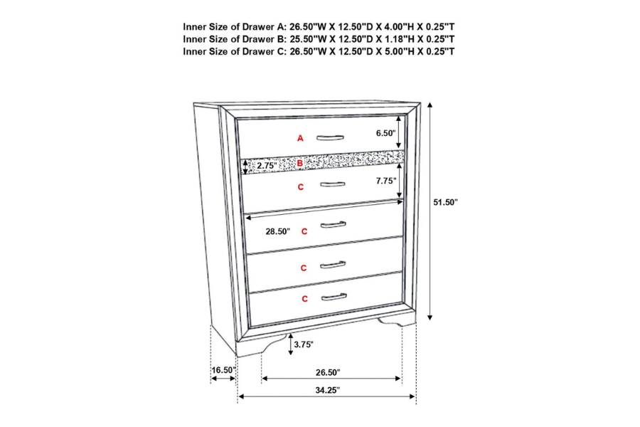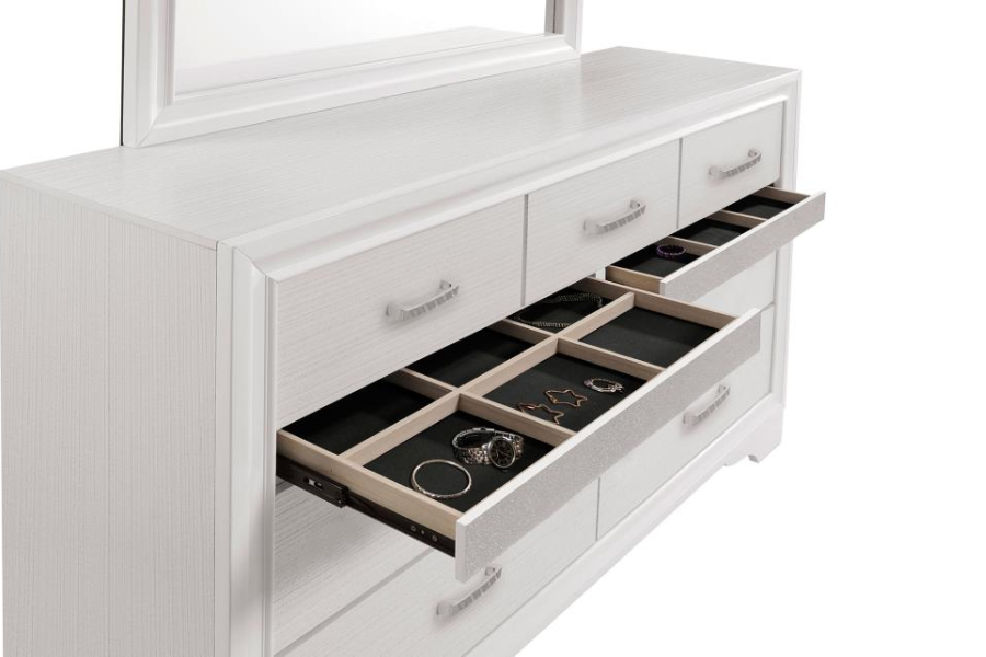 * Glittering stripes add energy to a contemporary design with glamour at the forefront * Elegant and timeless design with just the right amount of bling * Bed features storage at footboard and is fully slatted * Bed has platform system that will accommodate most mattress types and warranties including memory foam * 35mm drawer glides used for secret drawers in dresser & chest * Exclusive acrylic crystal pull handles set this collection apart * Available in a white or black finish |