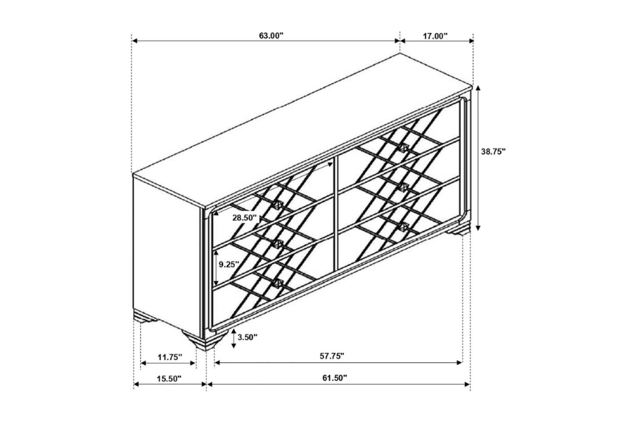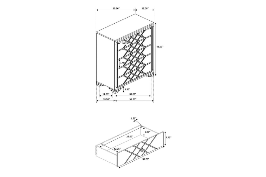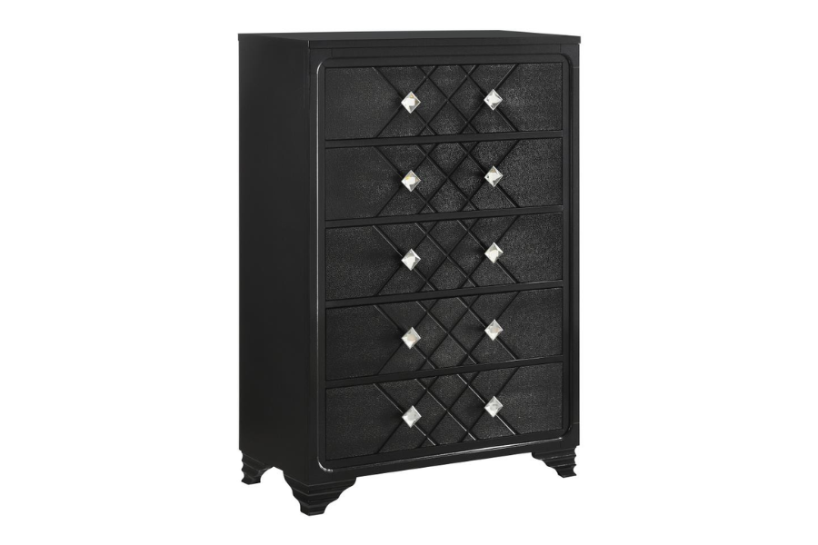 * Contemporary glam design with argyle pattern and an upholstered headboard * Acrylic bling knobs compliment the midnight star leatherette upholstery that is easy to maintain * Stingray embossed drawer fronts * Headboard and mirror feature blue LED touch lighting for ambiance * Metal ball bearing extension glides create stability and smooth operation |