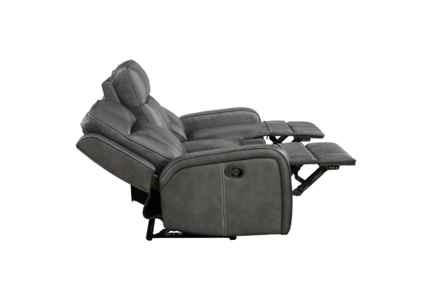 | * Mixed motifs suit both modern and transitional living spaces in need of a sofa * Enjoy prolonged hours of relaxation and comfortable seating with manual reclining * Trending grey leatherette upholstery with decorative topstitching adds easy-care and maintenance * Ample plush foam filling distributes perfectly to support different body positions * Adjust your seating position with ease using the pull handle located on the side panel |