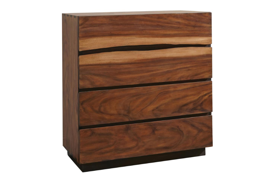 * Rooted in beautiful craftsmanship and true to the live edge movement, Madden collection is a stunning gift of nature * Featuring full-tree slab veneers with natural exotic variances, exposed dovetail joinery, floating bases and walnut bow tie inlays * Platform beds with storage * Fingertip pull drawers * Top right drawer of dresser includes a removable jewelry tray * Exclusive Coaster design |