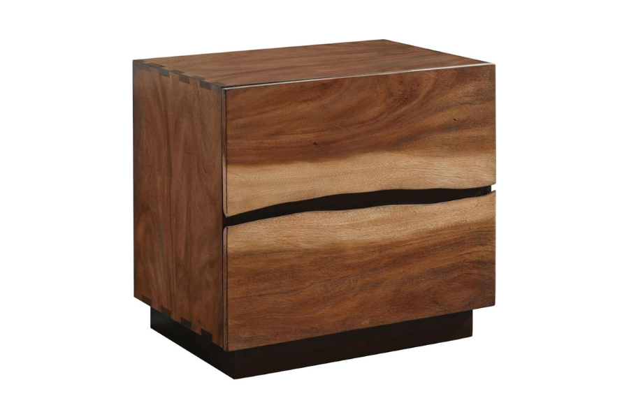 * Rooted in beautiful craftsmanship and true to the live edge movement, Madden collection is a stunning gift of nature * Featuring full-tree slab veneers with natural exotic variances, exposed dovetail joinery, floating bases and walnut bow tie inlays * Platform beds without storage * Fingertip pull drawers * Top right drawer of dresser includes a removable jewelry tray * Exclusive Coaster design |