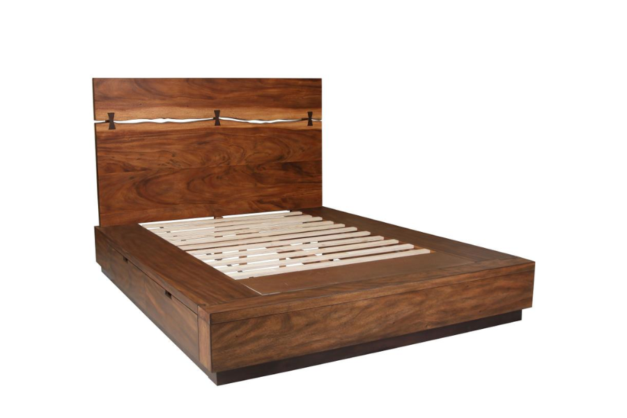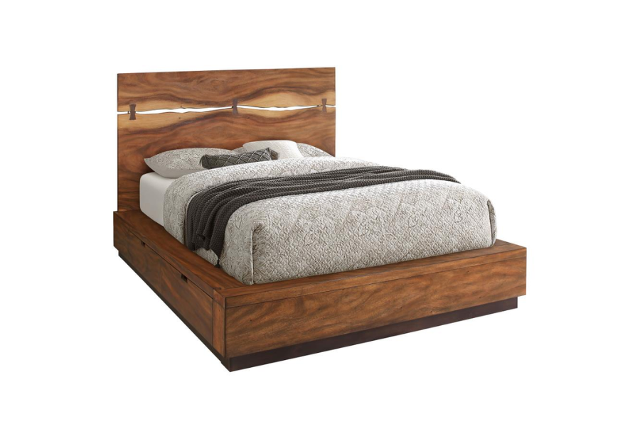 * Rooted in beautiful craftsmanship and true to the live edge movement, Madden collection is a stunning gift of nature * Featuring full-tree slab veneers with natural exotic variances, exposed dovetail joinery, floating bases and walnut bow tie inlays * Offers your choice of platform beds with or without storage * Exclusive Coaster design |